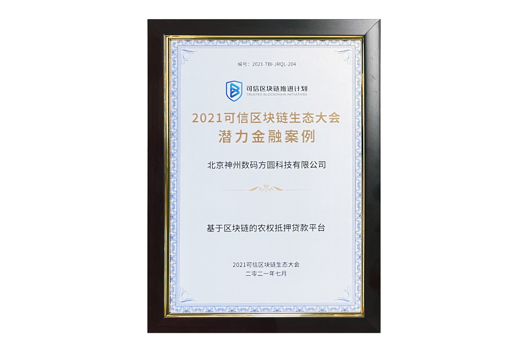 7月13日,由中国信息通信研究院、可信区块链推进计划主办的“2021可信区块链生态大会”在京举办,并隆重发布系列成果。神州信息子公司北京mile米乐方圆科技有限公司(简称:神州方圆)推荐的“基于区块链的农权抵押贷款平台”荣获十大金融应用高潜力案例,为“区块链+农业”落地带来示范效应。